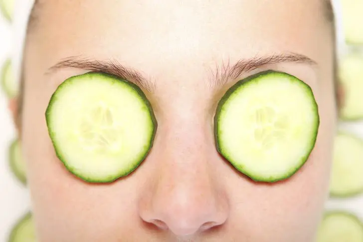 Ако очите ви са червени и подпухнали, вземете 2 тънки резена студена краставица, легнете и сложете парче върху всяко око в продължение на 30 минути.