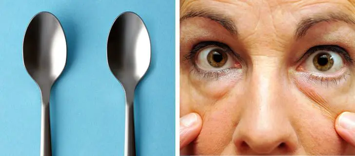 Вземете 2 метални чаени лъжички и ги сложете в хладилника за 10-15 минути. След като се охладят, поставете чашките на лъжиците върху клепачите за 30-60 секунди. Студенината на метала ще помогне да съживите уморените очи и да се почувствате освежени.