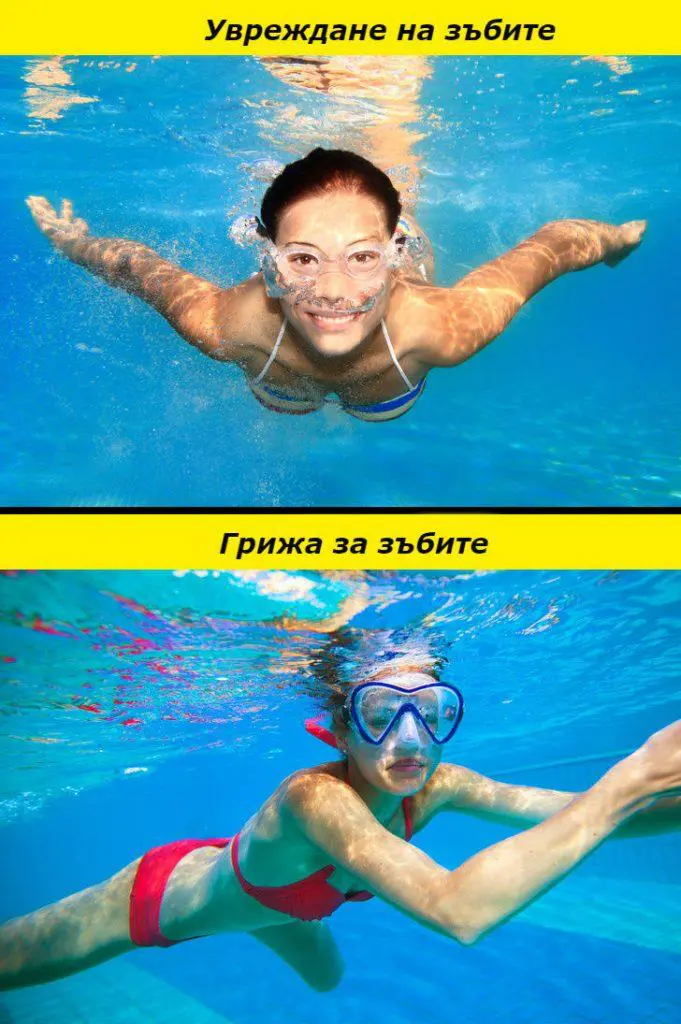 Разбира се, никой не казва, че плуването не е от полза за вашето здраве. Но проблемът е, че химикалите, използвани за дезинфекция на водата в басейните, имат ужасен ефект върху зъбите. През 80-те години американски учени публикуваха резултатите от проучване, фокусирано върху здравето на зъбите на професионалните плувци, 40% от които страдаха от увреждане на зъбния емайл.