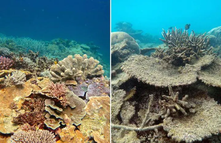Изменението на климата води до масово избелване на корали , причинено от „напускане“ на водораслите от кораловите полипи. Това води до глад на коралите и ако водораслите не се върнат, до евентуалната им смърт. Това от своя страна може да засегне около 25% от океанските видове, тъй като коралите осигуряват подслон на стотици хиляди ракообразни и други същества.