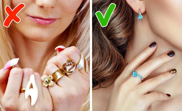 Според етикета на бижутата, общият брой пръстени на ръцете на една жена не трябва да надвишава 3, включително сватбения пръстен. Максимум 2 бижута се допускат от една страна. Имайте предвид, че след 17 часа се препоръчва да носите бижута с диаманти, изумруди и рубини.